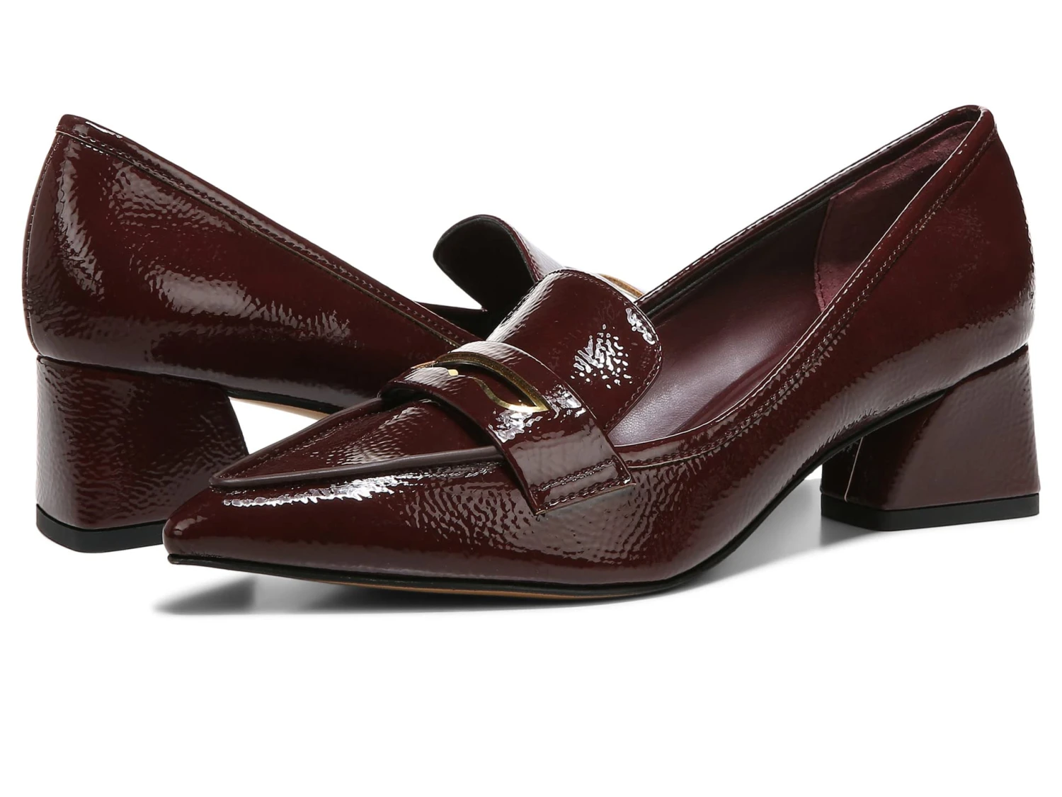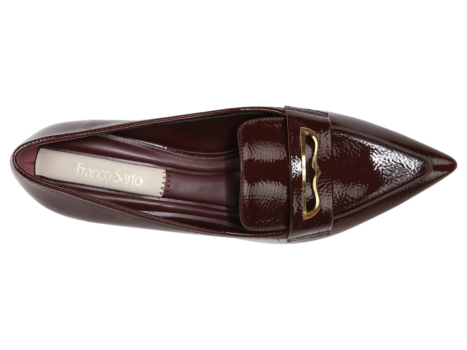 - Pointed toe with metallic accent on the vamp.